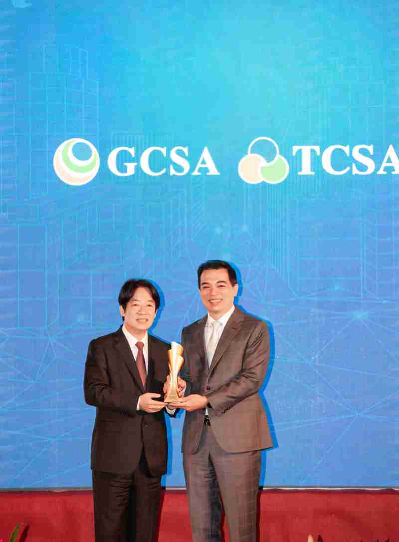 达全方位永续表现获全球永续奖及台湾永续奖肯定,,由副总统赖清德颁奖 (左),,,财神娱乐总经理柯富仁 (右) 代表领奖