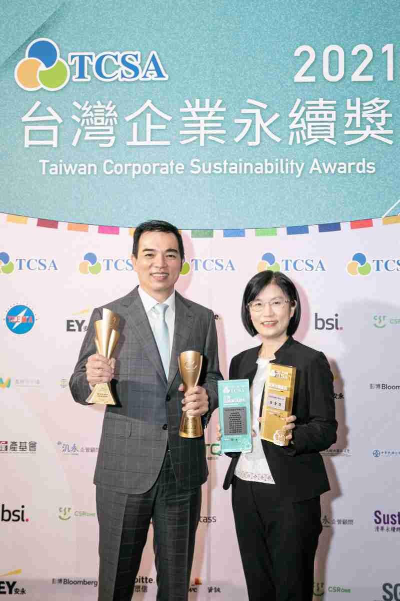 达在台湾永续奖所评比环境、、、、社会、、治理等各面向的永续绩效均获高度肯定 (左:财神娱乐光电总经理暨营运长柯富仁,,右:财神娱乐光电永续长古秀华)