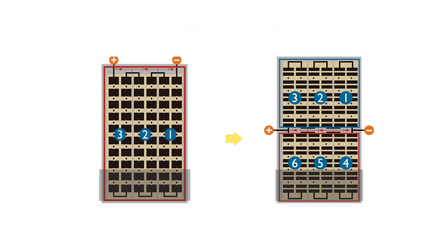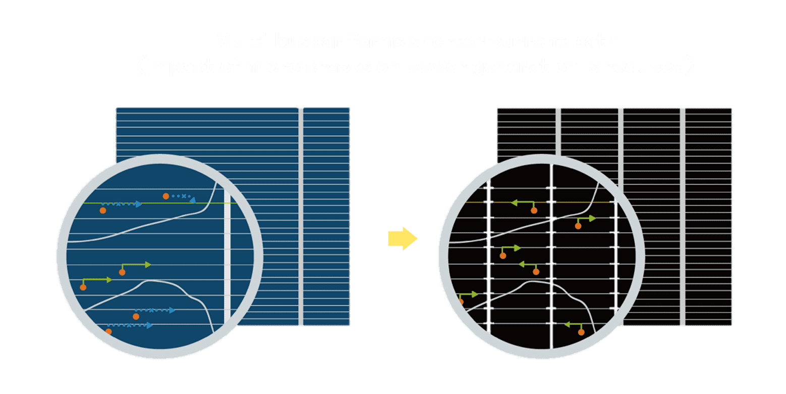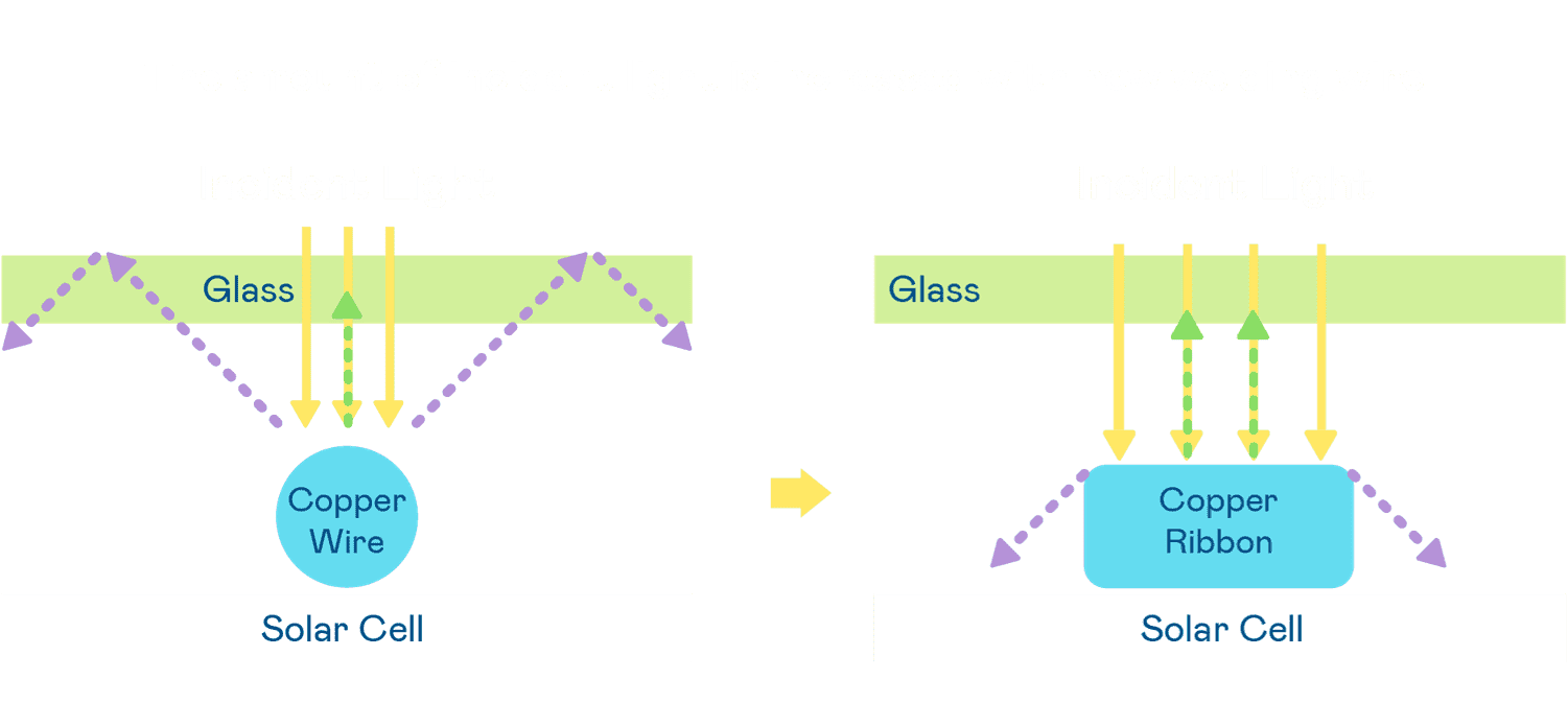 - 电池使用多条铜导线 (Copper wire) 于电池片上形成较短的电流路径,,,提高电流收集效率,,采用圆形设计的铜导线较传统扁平式的铜焊带 (Ribbon),,,可增加入射至电池的光线量。。。。