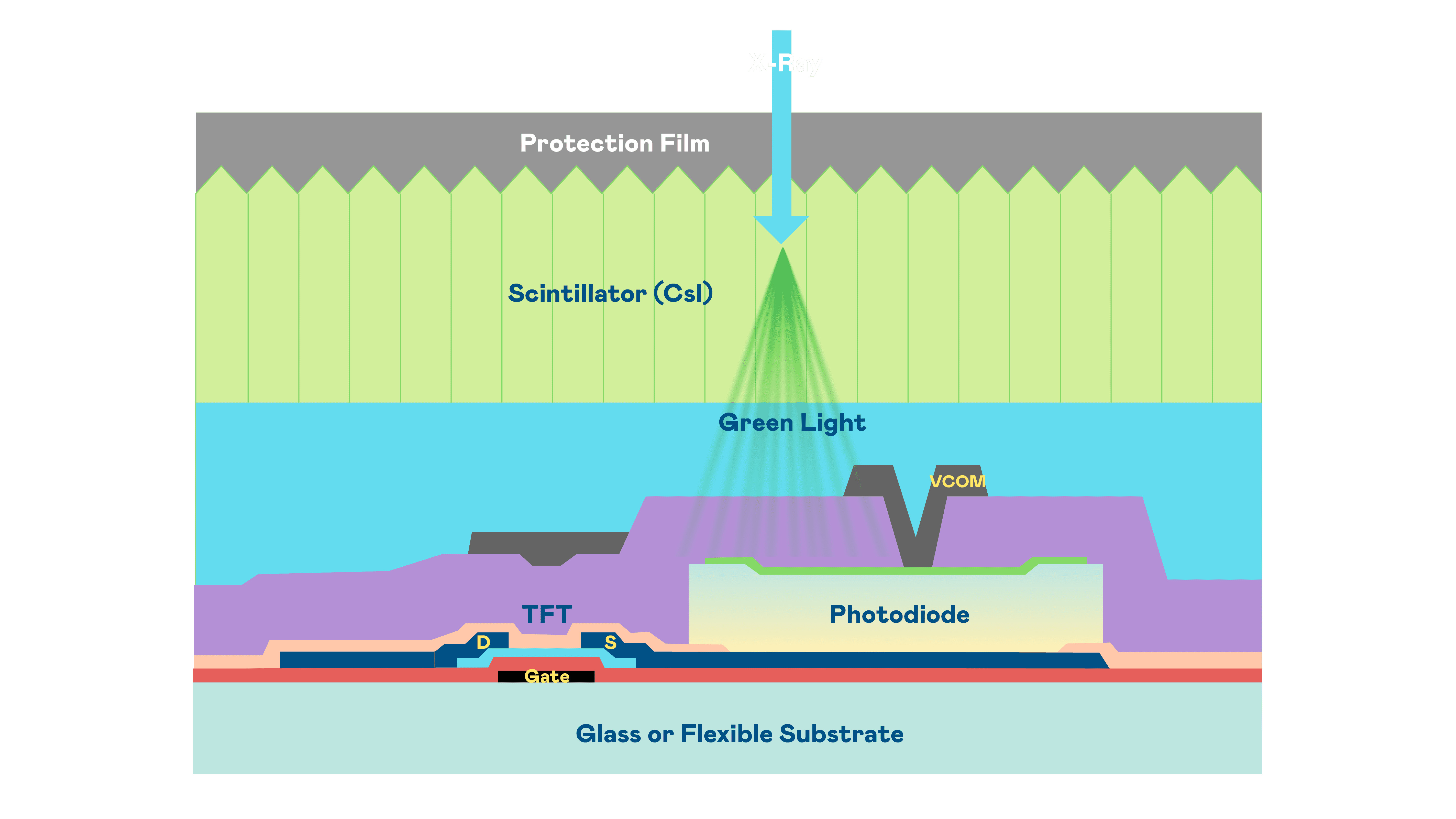 财神娱乐的X光影像感测阵列使用薄膜电晶体 (TFT) 作为每个像素的读取开关,,搭配光电二极体(Photodiode)的光电转换元件,,,,用以感测X光影像讯号。。。。